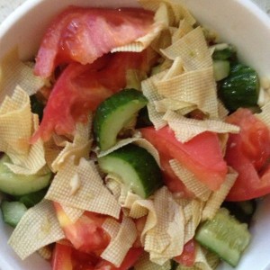 豆腐皮热水烫一下切三角形,黄瓜拍了,西红柿切块,蒜末及其他调料放在碗里拌好