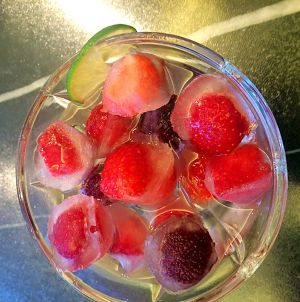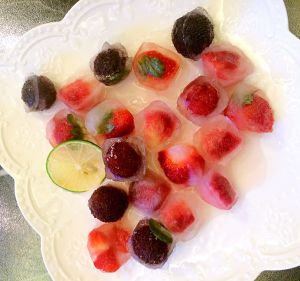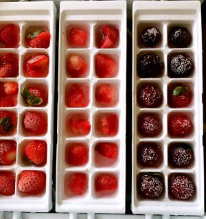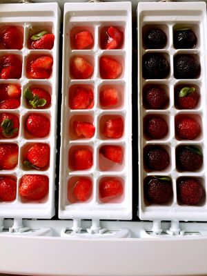 将草莓、蜜桃切成大小合适的块,放入冰格中,杨梅也一粒一格放好。将冰糖水浇在水果上。