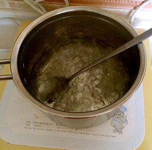 烧开纯净水,将冰糖放入水中,小火慢煮,轻轻搅拌,直至冰糖完全溶化。将糖水晾凉备用。