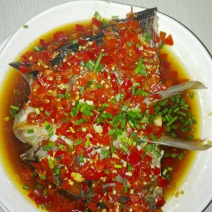 用小碗,调剁椒,放入剁椒,味精,鸡精,白糖,白醋,蚝油,姜末,调好盖在鱼头上,下锅蒸