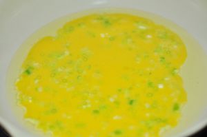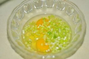 鸡蛋打散,加入小香葱葱花。加入少许的水,搅打均匀。
