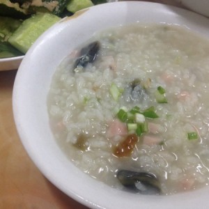 电饭锅里加水烧开,煮粥30分钟,之后放入皮蛋,香肠丁个大半葱花,姜丝,继续煮10分钟,如果喜欢咸一些可以加少许盐,(特别提示我在煮粥的时候放了鸡精,如果总瘦肉的话要提前加料酒和盐腌制10分钟)感觉加鸡精味道很好,个人建议