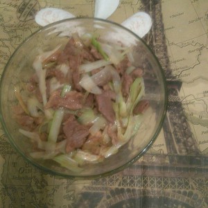 加入葱丝继续翻炒,加入一勺酱油,炒到葱丝变软关火。