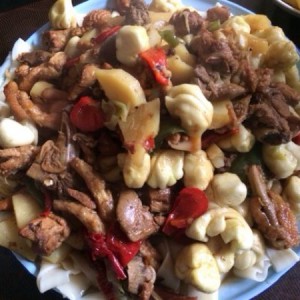 将热气腾腾的大盘鸡盛在皮带面上,味浓汤汁浇在皮带面上,来吃喽