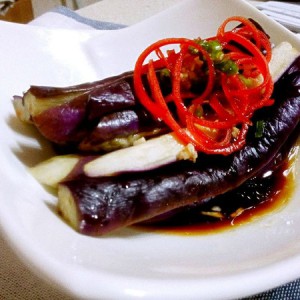 调好的味汁淋在摆好的茄子上,再放点切好的红辣椒丝即可。