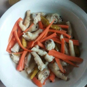 大约十分钟就足够,不要煮太久,否则鸡爪不脆,捞出用冷水反复冲洗,装入干净的容器内或者碗内,
