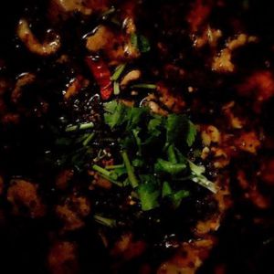 把之前炒好的辣椒麻椒和另一份葱姜蒜末放在菜上,锅中放油,烧到九成热浇在上边就可以了,把香菜碎撒上就完成了 灯光比较暗,所以拍的不是很好