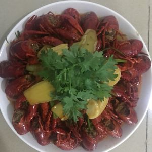 然后方入小辣椒,生姜,大蒜,大葱,香菜骨爆香,倒再倒入小龙虾,翻炒一会,加入开水,然后加入盐,鸡粉,生抽,蚝油,大火收汁即可,装盘摆盘