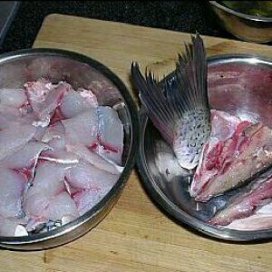 开始片鱼片,将鱼肉皮朝下至于案板上,菜刀按由头向尾的方向斜向入刀,千万别弄反了,要不鱼肉中的小刺就被切断了,鱼片就没法吃了,片鱼片的时候可以按一连一断的方式下刀,这样片出的鱼片会呈蝴蝶状。