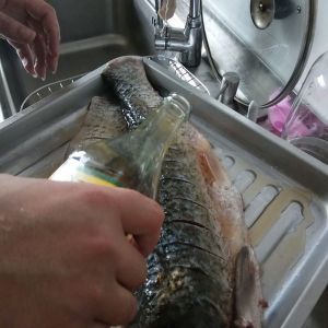 腌制好的鱼放入酱油,撒上花椒粉,孜然粉,辣椒粉均匀的抹在鱼身上