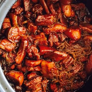 中火炒三分钟后倒入砂锅中,加水,水高过肉即可。