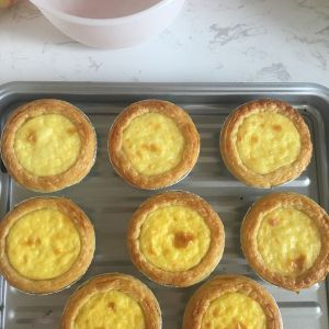 速冻蛋挞皮提前拿出来室温解冻摆在烤盘上备用
