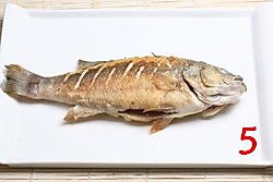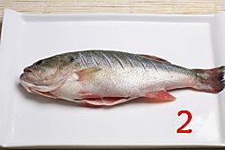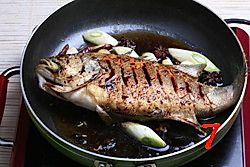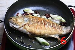 在两面切上几道,不要太深,沥干水分;两面鱼身分别划几道口(烧的时候容易入味),用盐、胡椒粉、绍酒。