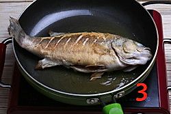 锅烧热,先用生姜擦一下锅底(这样煎鱼的时候不容易把鱼皮粘住)倒入油适量,油温热后然后把鱼放入油锅,煎至两面金黄。