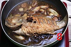 加入开水大火烧开,转小火等烧到鱼身可以用锅铲拨松,翻身加盐、糖、调味,等汤汁微微收浓,撒上香葱,出锅装盆撒上烤熟的松子。