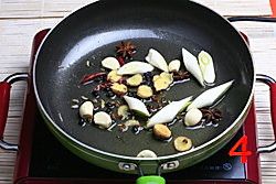 放入切好的葱、姜、蒜、八角、花椒、小茴香、豆豉、煸出味。