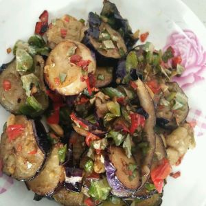 分批次煎好后,锅中留适量的油,放入切碎的青椒红椒和蒜子,加入适量的盐和鸡精,爆炒一会,加入茄子。