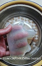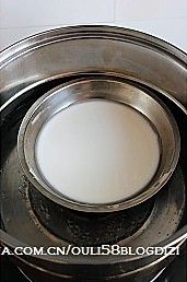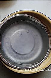 铁盘中刷薄薄一层油防沾,接着盛入适量淀粉液,转一下使盘内淀粉液平摊均匀,然后坐在锅的水面上,我的盘子轻,直接飘在了水面上