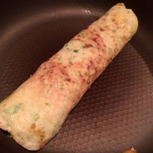 看到面糊差不多凝固(我又加了点榨菜)可以翻面