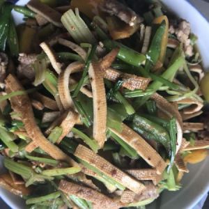 倒入芹菜,立刻放盐,辣椒末,生抽,料酒翻炒片刻