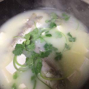 二十分钟后加适量盐,关火,加入香菜,营养美味的鲫鱼汤可以品尝了。