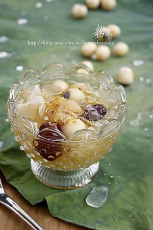 45分钟后,放入鲜莲和冰糖,高火15分钟,放凉后淋上糖桂花即可开吃,或是放入冰箱里冻着吃。