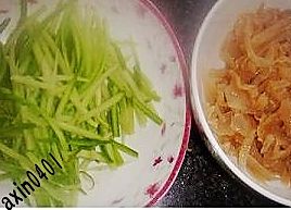 泡好的海蜇切丝用水洗一遍,用手挤干水份