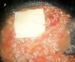洋葱丁随后倒入一起翻炒,加入蕃茄丁,快炒后加一片奶酪,和一碗水