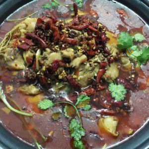 把鱼肉起锅后再把锅中放入之前备的香料油,放干辣椒段和花椒,麻椒