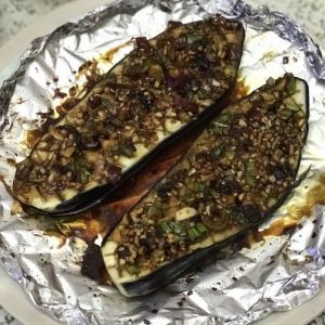 将茄子刷油!多刷点!烤盘铺锡纸后放在锡纸上!准备好的料铺在茄子上、