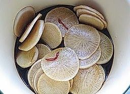 白萝卜清洗干净切成片后放入容器中;撒上盐用手抓匀后腌制一个小时后把萝卜里渗出来的水倒掉;