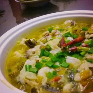 放上鱼片,椒辣,花辣,最好花辣用热锅炒酥,用刀柄研碎,这样吃时候花辣不会太嘛了 。