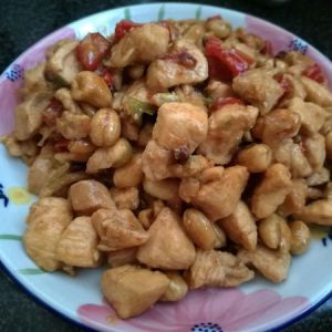 热水泡后,去掉花生皮,然后用油把花生仁炸成金黄色捞出放凉备用