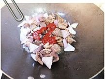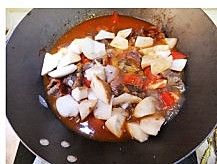 再放入牛肉块。调入番茄酱和白糖翻炒均匀。