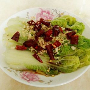 蒜切蒜蓉,干红辣椒切小截,娃娃菜捞出摆盘,将蒜蓉和干红辣椒码菜上。