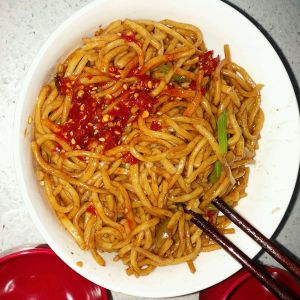最后倒入面条,一起翻炒,依据口味继续加入老抽,味精!出锅!