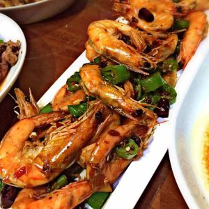 倒入生抽、蚝油、糖、水、盐将虾炒至入味,虾肉颜色变红后大火收汁