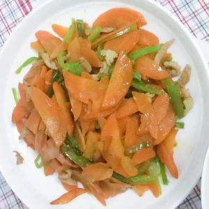 继续加入少量的油,热锅凉油,放入胡萝卜翻炒,直到胡萝卜变色即可,再加入青椒翻炒,大概半分钟之后加入炒好的肉丝,翻炒片刻加入适量的盐和生抽,即可出锅咯~