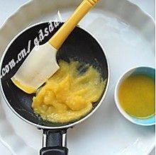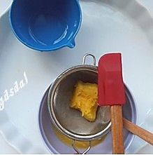 红薯肉放在茶滤勺中,用刮板或小勺一边刮捻一边同时加开水,捻成泥并压滤到滤勺下的小碗中,用小勺刮下粘在滤勺底下的薯泥;弃掉滤勺中的粗纤维;