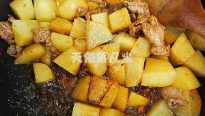 锅里倒油,油热后放入肉片炒片刻,加入酱油、土豆、食盐至熟时加入鸡精。