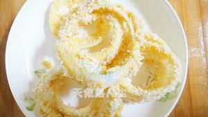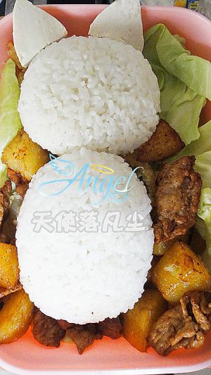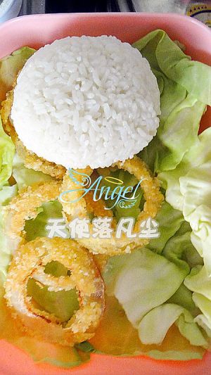 便当盒底铺上一层焯过水的包菜叶垫底,铺上洋葱圈,米饭用保鲜膜做出椭圆形猫咪的头放在合适位置。