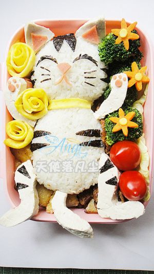 用火腿肠修出猫爪垫和耳朵、嘴巴装饰,摆上西兰花、胡萝卜刻花装饰,摆上蛋饼玫瑰、小番茄装饰,海苔剪出猫咪眼睛、花纹等,可爱的猫咪就诞生了。