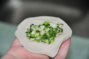 将馅料包在饺皮中。