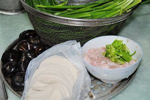 备韭菜,饺子皮,五花肉末,葱花及马蹄。