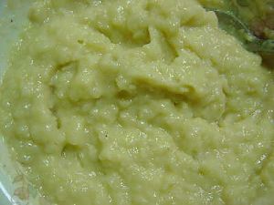 倒入调好的牛奶鸡蛋汁,加适量面粉,拼命地搅啊!