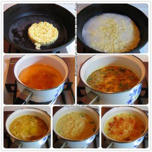 中烧开水,将方便面饼放入锅中煮至八成熟,捞出沥干水分。