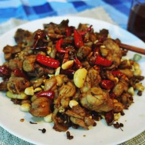 鸡腿两只剔骨切丁(用生抽、料酒、耗油腌制十分钟),朝天椒,花椒,姜和蒜,熟花生米。