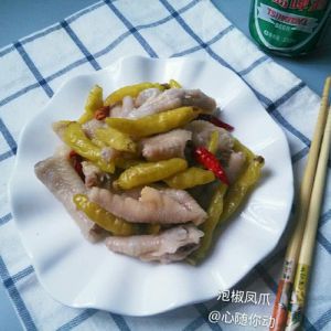 取一个干净的容器,把鸡爪,泡椒放进去,加入2碗凉白开水,以未过食材为准,1汤勺白酒,1汤勺白醋,1匙盐,红辣椒拌匀,放冰箱冷藏泡制一天即可食用。