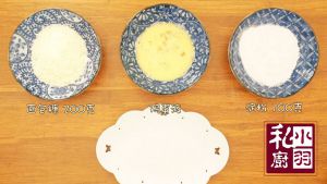 ▲准备三个大碗,分别放上干淀粉、一个打散的鸡蛋、面包糠。