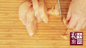 ▲切好的鸡肉丁,加入5克的盐,3克的白胡椒粉,1个鸡蛋的蛋清,用手抓匀,腌上15分钟左右。